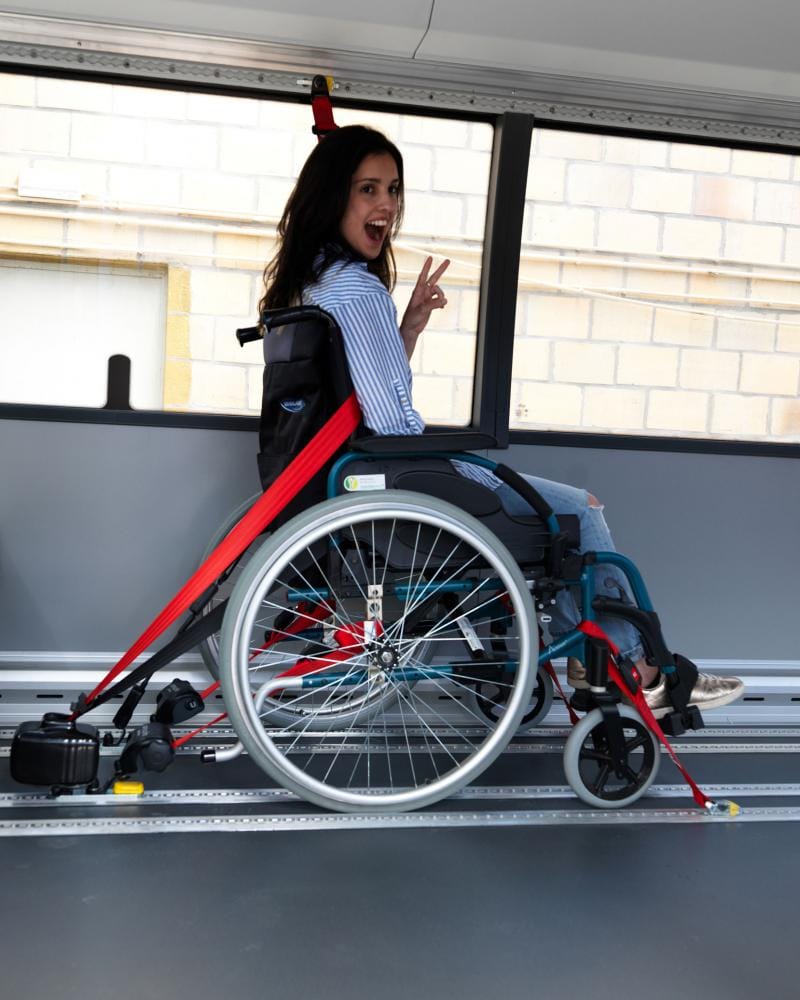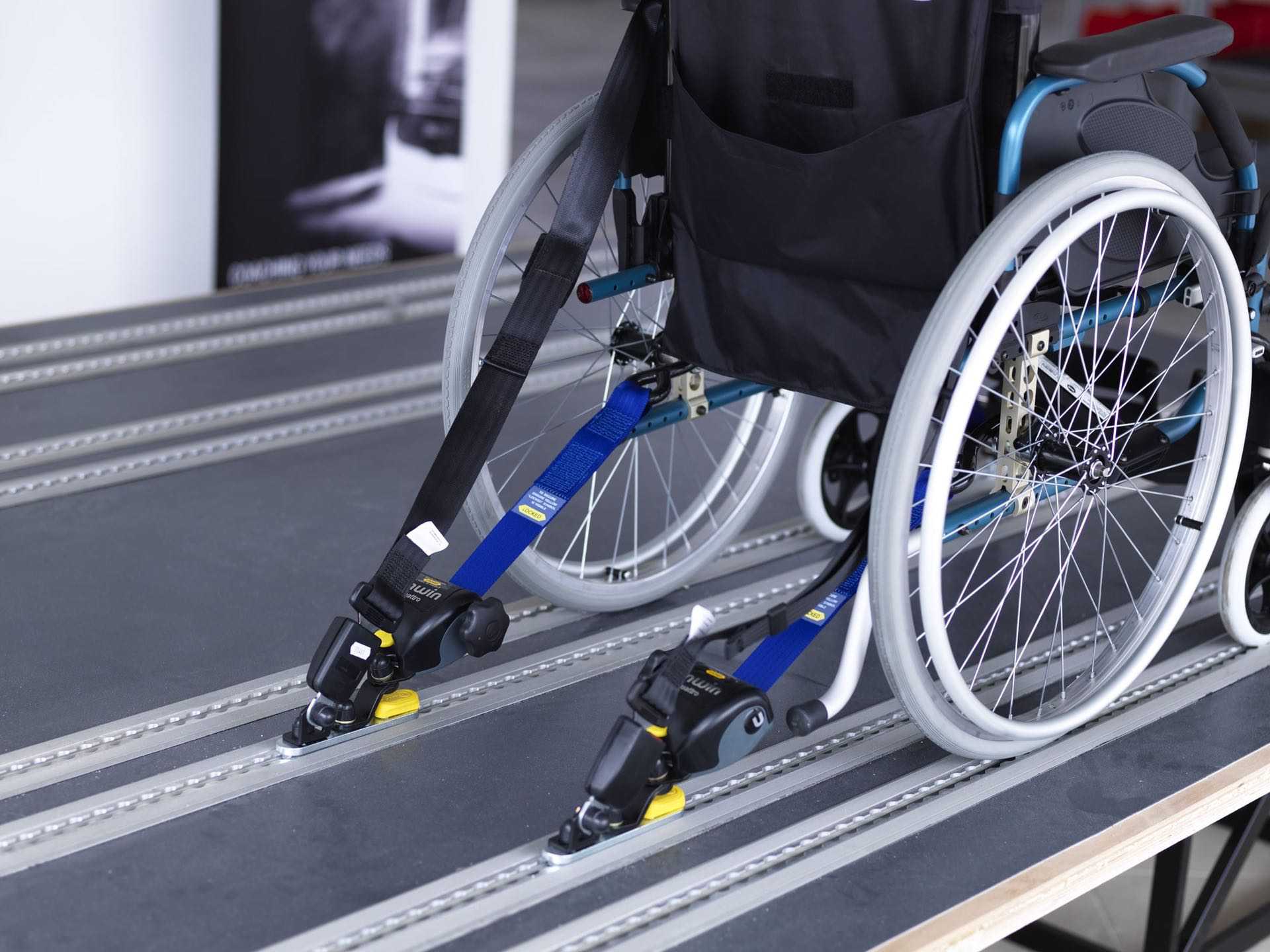 The wheelchair is secured at 4 points, 2 at the front and 2 at the back. In order to guarantee maximum safety for the wheelchair user, a lap belt and a shoulder belt are also provided.